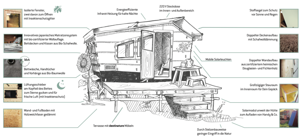 Mit dem „destinature Dorf“ konnte ein zukunftsfähiger Urlaubsort aufgebaut werden, der für einen respektvollen Umgang mit der Natur steht – geschaffen für einmalige Erlebnisse und bleibende Erinnerungen. Als Schlafplätze dienen den Gästen entweder Tiny Houses mit verschiedener Ausstattung oder Betten to Go auf Rädern, die nach Belieben platziert werden können. Abgerundet wird das Angebot durch einen Wellnessbereich in der Natur, ein Bio-Bistro, Sanitäranlagen mit Waschmaschine und Trockner sowie Reparatur- und Lademöglichkeiten für Fahrräder. Das komplette Hüttendorf ist konsequent aus nachhaltigen Materialien gefertigt und kann rückstandsfrei wieder abgebaut werden. Laut Betreibern zahlt sich das Engagement in Sachen Nachhaltigkeit aus: die Gäste schätzen die Nachhaltigkeitsbemühungen und kommen gerne wieder.